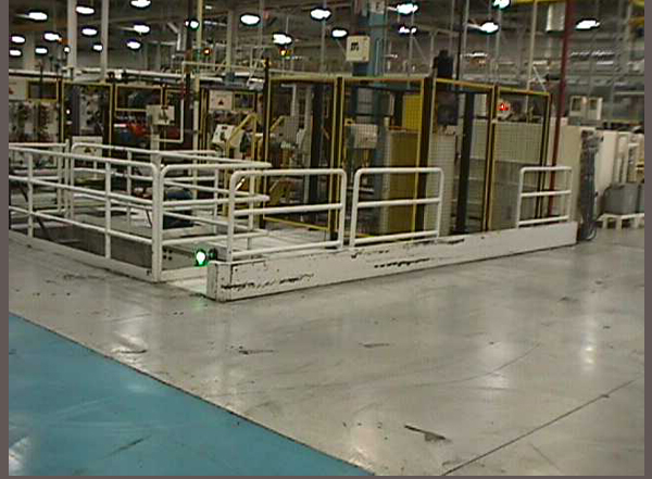 Heavy channel with railing for forklift tire protection around pit steel framing.