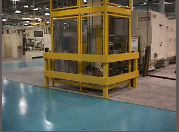 Guard posts and railing to protect elevator from vehicle traffic. Framed screen guard to protect pedestrian traffic from moving machinery of falling parts.