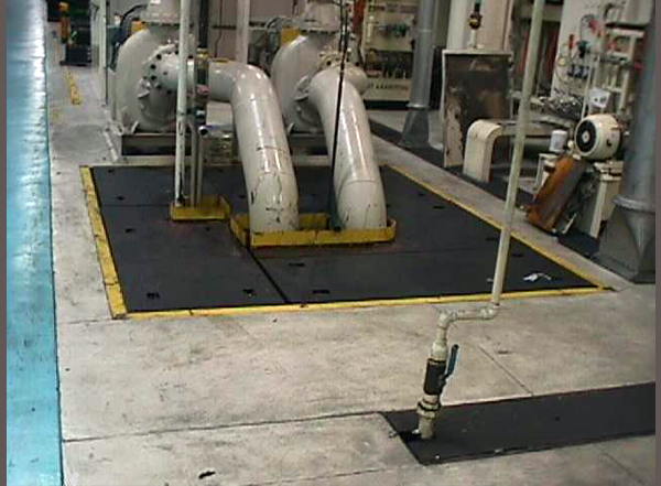 Sump pump floor cover plate designed to support forklift traffic. Individual cut-outs for pipe or electrical penetrations with kickplates. Recessed lifting rings to avoid trip hazards.